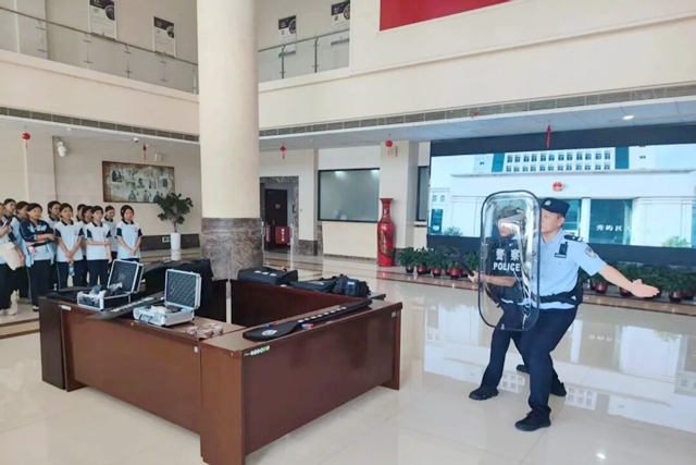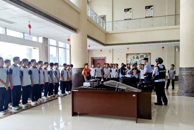 活动中,该院法警大队副队长杨智雄警官带领学生们走进警用装备展示区,细致讲解手铐、警棍、防刺背心等装备的功能与使用规范。在确保安全的前提下,邀请学生亲手触摸、佩戴装备,亲身感受司法警察的工作日常,现场互动氛围热烈。随后,立案庭讲解员全程引导学生参观立案大厅、审判庭等场所,结合生动案例,清晰拆解“立案—审理—执行”全流程,从如何提交诉讼材料,到法官如何开庭审理,再到判决生效后如何执行,每个环节都讲解得通俗易懂,学生们对法院职能有了全面的认识。