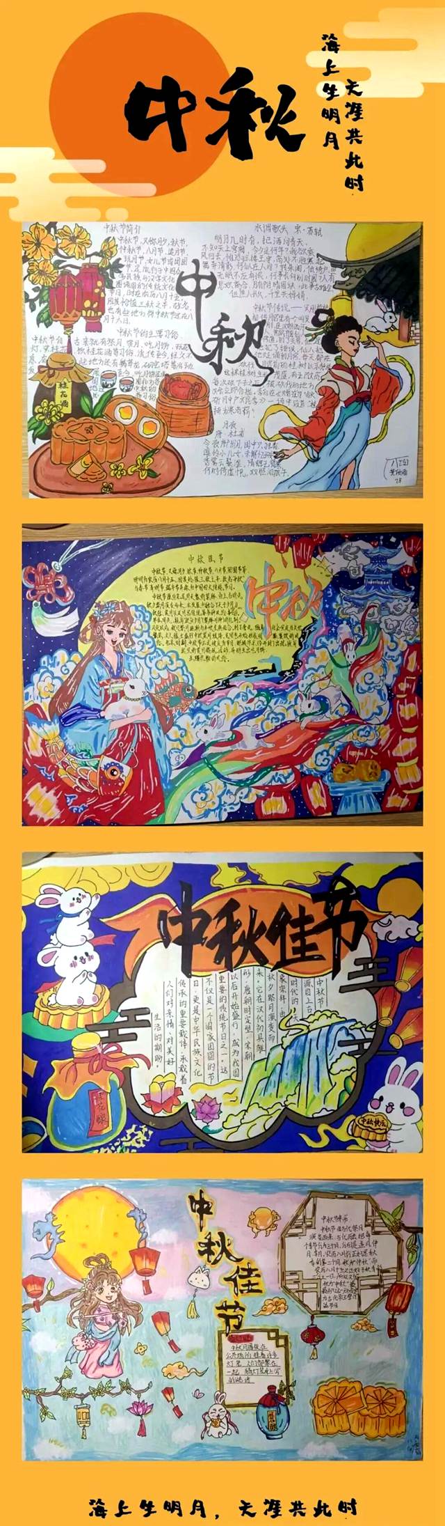 活动深度融合美术学科优势,让学生在创作中感悟传统。初中部“中秋书月圆,创意绘团圆”手抄报设计,引导学生以图文并茂的形式诠释中秋意蕴;高中部“月映中秋,绘梦翱翔”主题绘画,则鼓励学生用画笔描绘团圆场景与家乡风物,展现扎实美术功底与丰富情感。一幅幅作品不仅是节日的献礼,更是美育成果的生动展示。
