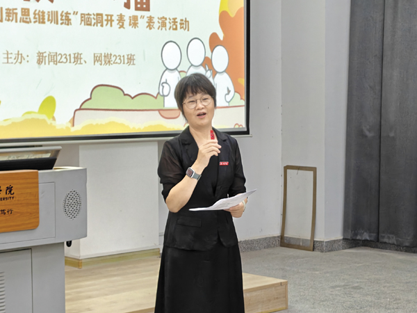 新闻系副教授阮榕在媒体创新思维训练课程实践展示“有梗有传播·脑洞开麦课”表演活动前致辞。洪依依/摄