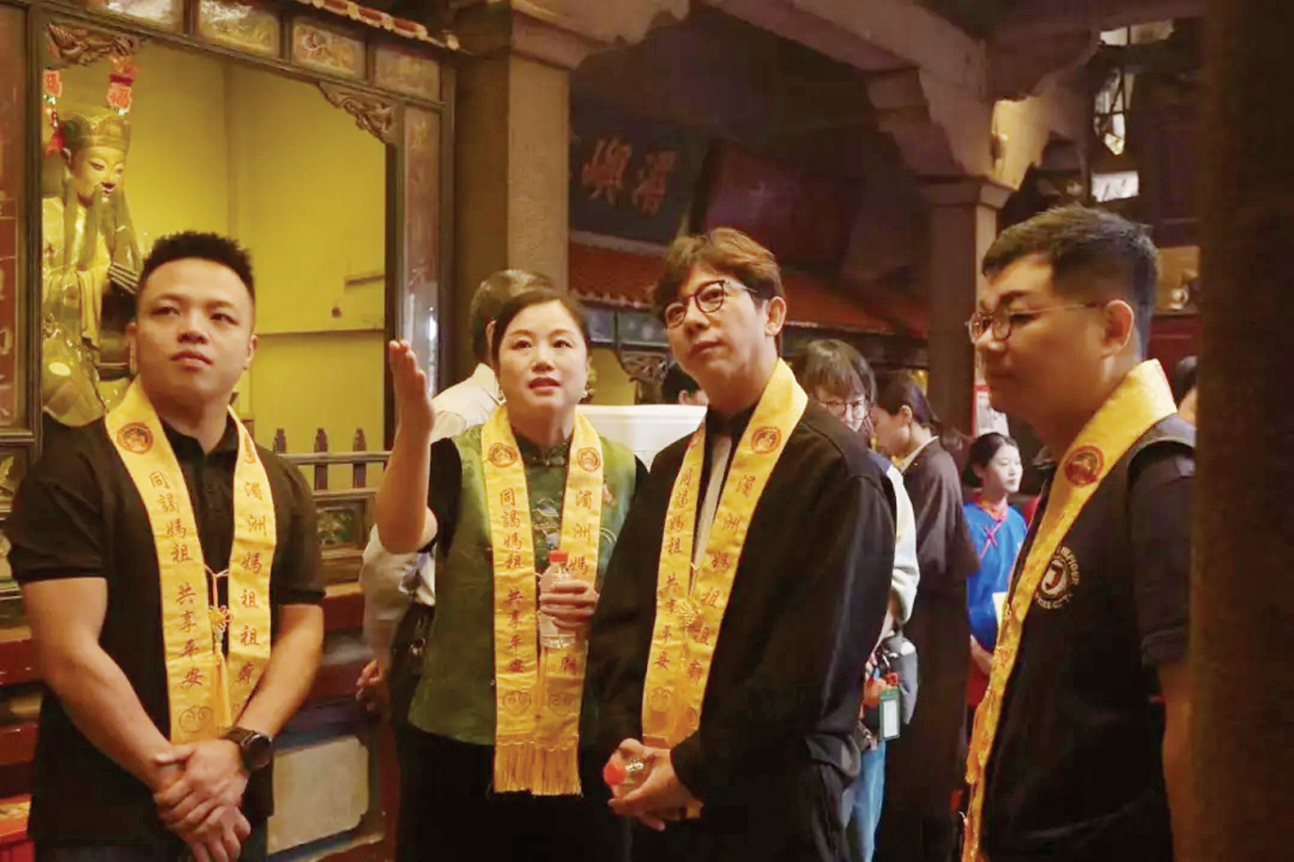 随后,胡海泉一行在李少霞等人的陪同下,先后走访湄洲妈祖祖庙建筑群、天妃故里遗址公园、妈祖影视城等文化地标。途中,通过聆听妈祖传说、探寻文化起源、了解《缘起湄洲》创新演绎成果等方式,全方位汲取创作灵感,为妈祖主题歌曲积累丰富素材。