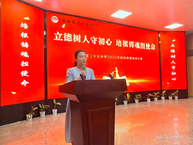 为深入学习贯彻习近平总书记关于教育的重要论述,落实“立德树人”根本任务,进一步强化教师队伍师德师风建设,10月30日晚,莆田第二十五中学举行“立德树人守初心、培根铸魂担使命”师德师风演讲比赛。