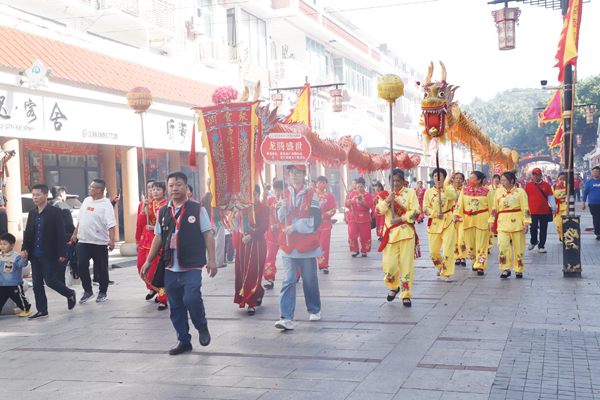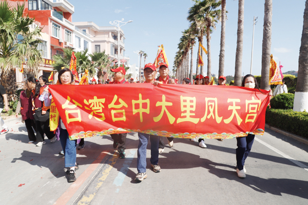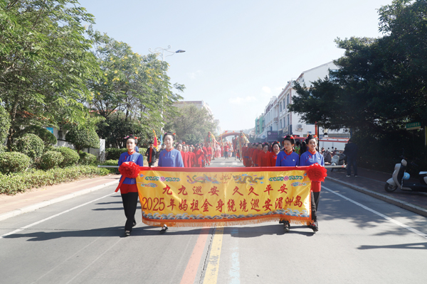 由两岸非遗民俗阵头组成的巡安队伍从祖庙出发,长长的队伍犹如一条巨龙,沿着祖庙西轴线大牌坊、朝宫街、金海岸沙滩等既定路线行进,踩街队伍所经之处,吸引了成千上万海内外妈祖敬仰者、游客夹道欢迎。