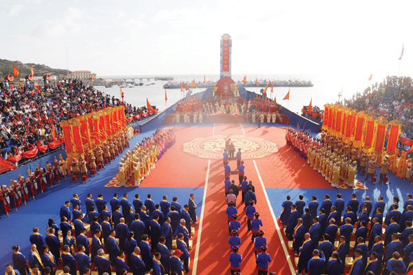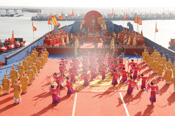 当天下午,纪念妈祖羽化升天1038周年大会暨海祭妈祖祈福大典活动,在湄洲岛下山村深澳底妈祖福船上举行。来自智利、菲律宾、新加坡、泰国等7个国家,以及中国台湾、香港、澳门地区,北京、浙江、上海、广东、海南、天津、山西、福建等地5000多名妈祖文化团体代表齐聚于此,共同祭拜妈祖。