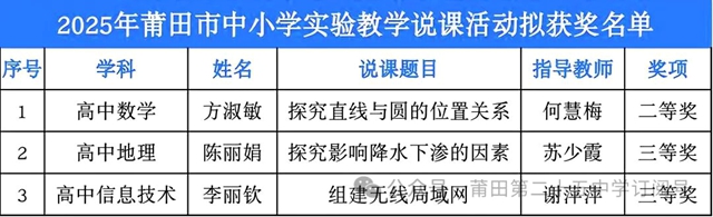 在“2025年莆田市中小学实验教学说课活动”中,该校教师以巧妙的实验设计和深入的说课讲解,征服评委,荣获1个二等奖、2个三等奖,体现实证精神在该校实验教学中的扎实落地。