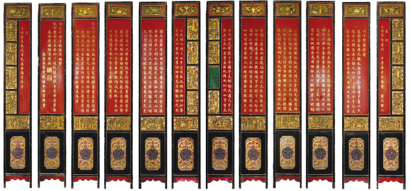 涂庆澜于清光绪七年(1881)正月为陈少亭夫妇所撰写的六十双寿序,由戴禧年书写在围屏上。围屏用楠木制作,共12扇,每扇高320厘米、宽42厘米、厚4厘米。12扇金字围屏曾在1989年初被盗,后经公安破案追回。如今此套围屏仍保存在象峰村村部。寿屏文: