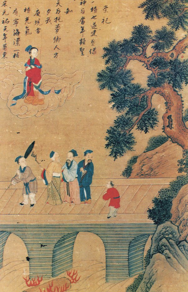清代《天后圣母事迹图志》《天后圣母圣迹图志》中“明前迹复现神槎”同载:“莆东宁海桥头,众方渡,见光中缥渺(缈)浮一古木,其状绝异,顺流而前,人莫之识。至夕,乡人得梦,知当年显应神槎云。”工笔重彩画与木刻版画虽构图各异,但画中的云海、神灵与人物彼此呼应,共同生动地刻画了宁海桥的独特地理风貌——此处溪海交汇,洪潮顶托,以致水势湍急、泥沙滚滚。这种精湛的描绘,赋予了“莆东宁海桥头”极强的真实感与临场感,令读者仿佛身临其境。