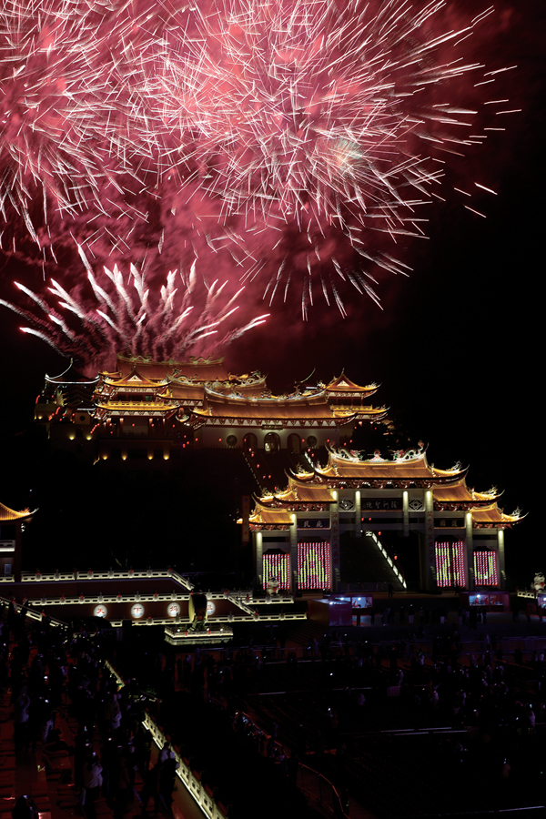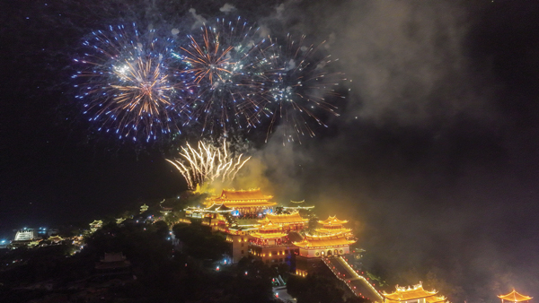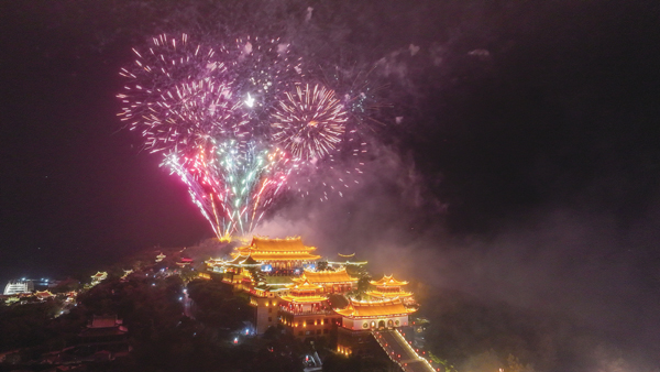 随着零点临近,全场观众共同倒数。新年钟声敲响的瞬间,璀璨烟花在祖庙上空绽放,漫天星火与妈祖圣境交相辉映,现场观众纷纷用手机记录这一浪漫时刻,在烟火光影中许下新年心愿。