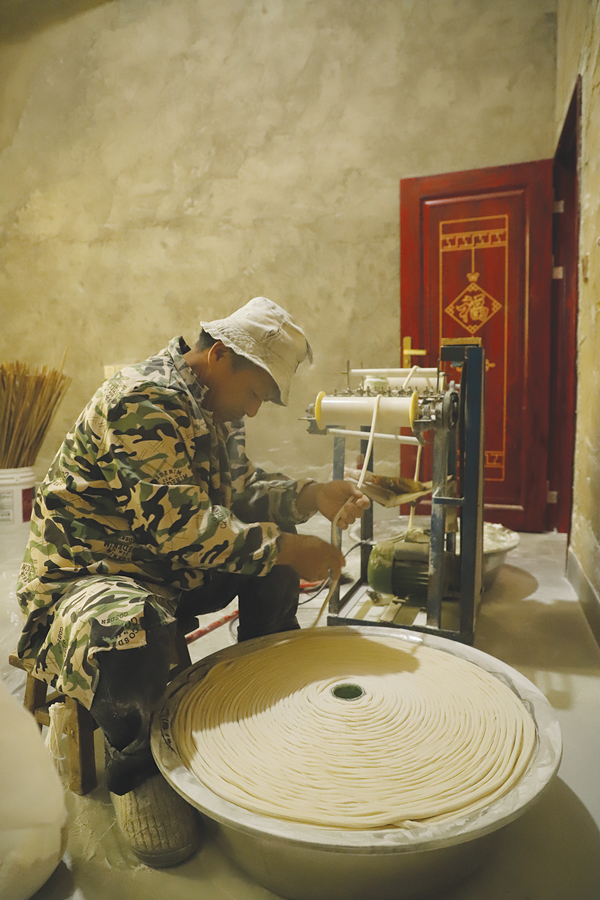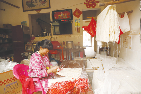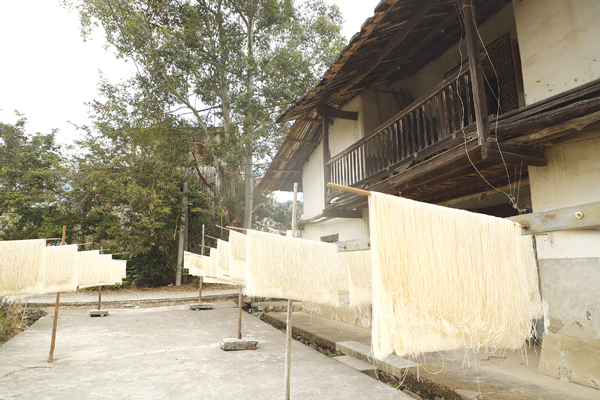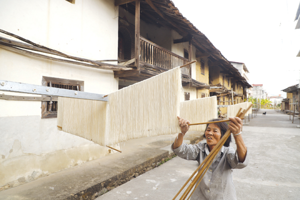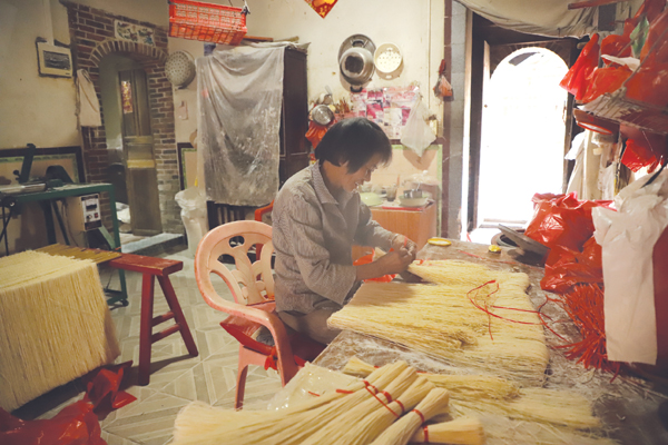 “晋江厝”人很勤快,他们除了勤耕农桑,还懂得搞副业,几乎每家每户都会做“绳面”(线面)。早期都是以纯手工制作,起早摸黑,夫妻两人一天只能做40千克。而现在和面机搅拌替代,节省了和面的体力活,但接下来的流程仍需手工制作,醒面、开面、盘面、绕面、拉面、折面等过程都是技巧活;制作完成的线面,还需要看天气晾晒、捆面等后续流程,方能做出质感的线面。他们做的“绳面”,是当地的“品牌”长寿面,畅销四乡八里,增加经济收入。