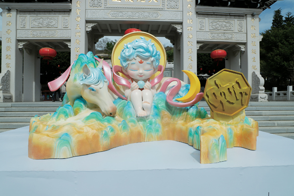 作为马年文旅IP“妈祖福佑·骏驰骉骉”的开篇之作,“诞降”装置以五行之土为基底,马身化形山峦静卧湄洲岛上,婴儿妈祖手持定风珠的形象传递“喜从天降”的吉祥寓意;“开悟”装置融入五行之木特质,马身装饰妈祖花,马嘴衔着莆田“状元红”荔枝,少女妈祖凝神悟书的造型寄托“禄运亨通”的美好祈愿。两款装置均巧妙嵌入湄洲地域元素与莆田特色符号,延续了“祖庙萌妈”的亲和力与文化辨识度。