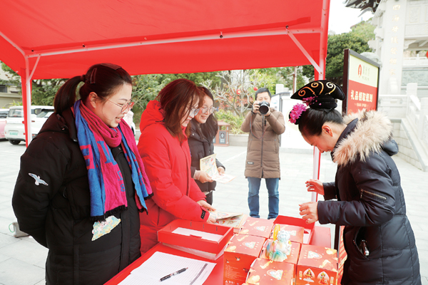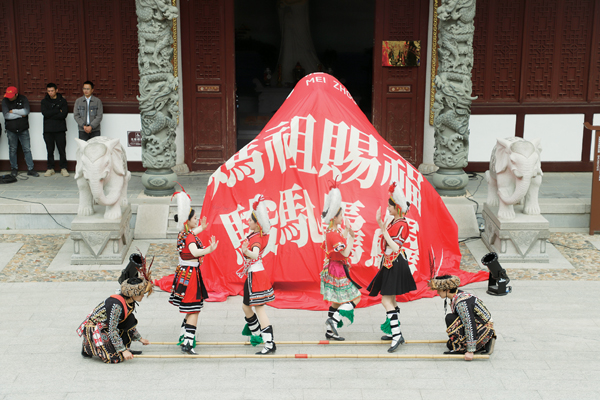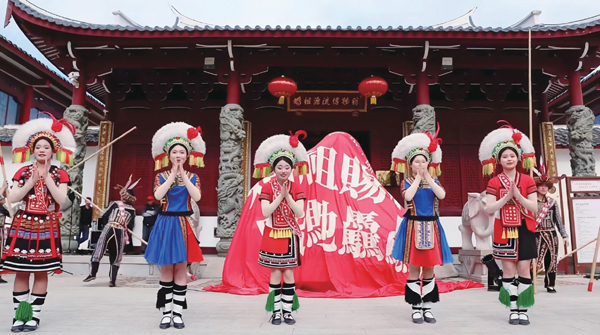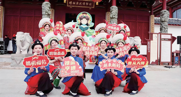 亮相仪式上,舞蹈《两岸情缘》《湄女风情》等精彩节目轮番上演,为即将到来的农历马年春节增添了浓浓的节日气氛。湄洲女携手揭开红幕布,配合烟雾机、花瓣喷射等特效,瞬间点燃现场氛围。活动现场,还精心设置了免费领取限量主题贴纸、主题打卡参与“掷杯”抽奖等内容,吸引了不少游客、妈祖敬仰者参与。