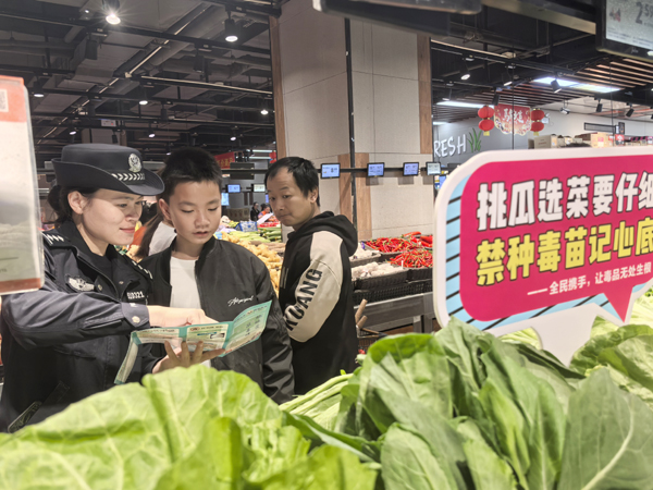 本报讯 2月15日上午,城厢公安分局充分利用节前居民采购年货的有利时机,在城厢区华亭镇镇中心超市组织开展“禁毒宣传进超市 守护居民菜篮子”主题宣传活动。活动现场,民警通过设立咨询台、展示仿真毒品模型、发放禁毒宣传资料和主题气球等多种形式,向过往购物群众和周边居民普及毒品的种类、危害及防范知识。针对当前春季禁种铲毒的关键节点,民警创新宣传方式,在超市人流量密集的果蔬摊位区域精心设置了禁种宣传标语,引导群众自觉抵制非法种植行为,将禁毒知识送到群众身边,营造全民参与禁毒的浓厚氛围。(蔡进佳)