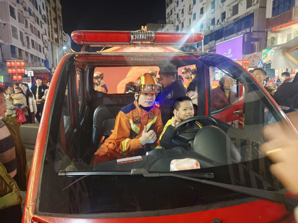 “火焰蓝”宣讲小队则以莆仙方言精准科普:遇到驻足观看的老年人,重点叮嘱厨房用火不离人;看到结伴而行的学生,提醒要在指定区域燃放烟花;外卖骑手接过传单时,现场对比头盔与防烟面罩的佩戴区别,讲解逃生面罩的正确使用方法。街区中央的消防车成为打卡点,孩子们登车体验、合影留念,身后“倒福接福”灯光布景前留下不少家庭的笑脸。