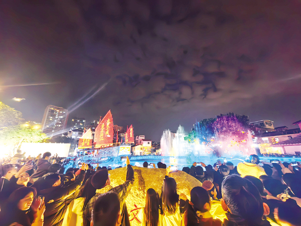 记者在现场看到,夜游现场人头攒动,阖家出游、好友结伴、亲子打卡成为新春主流。不少市民带着老人孩子沿着水街漫步,在光影秀前驻足观赏、拍照留念,欢声笑语此起彼伏。