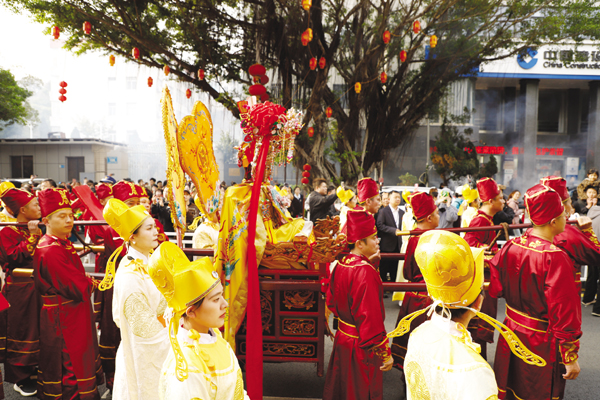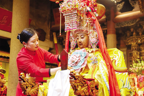 24日上午9时58分,湄洲妈祖祖庙现场锣鼓铿锵、人潮如织,浓浓的元宵年味扑面而来。两岸妈祖敬仰者怀着无比崇敬的心情,共同参与妈祖金身起驾仪式。天后宫内,祖庙董事会董事长林金赞偕祖庙全体董监事、值年福首及在岛的台湾乡亲代表一道,行三献礼,恭请妈祖金身起驾出巡。