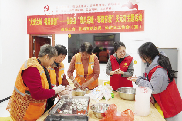 “情暖元宵·驿路同行。”当天,该县总工会邀请县城市管理和综合执法局、仙游义工协会等爱心单位参与“我们的节日·元宵”为主题的温馨活动,在4个工会驿站亮出送汤圆等“大招”,提供特色贴心服务,让户外劳动者们在元宵节感受到“家”的温暖。
