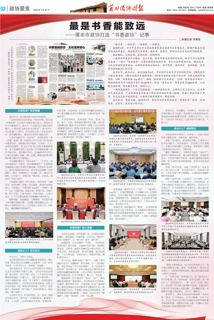 新征程上,莆田市政协将持续深耕“书香政协”建设,以书香润心、以学习赋能、以实干担当,为奋力开创中国式现代化莆田实践新局面汇聚更强政协智慧、贡献更大政协力量,让履职之花在书香浸润中绽放得更加绚烂夺目!