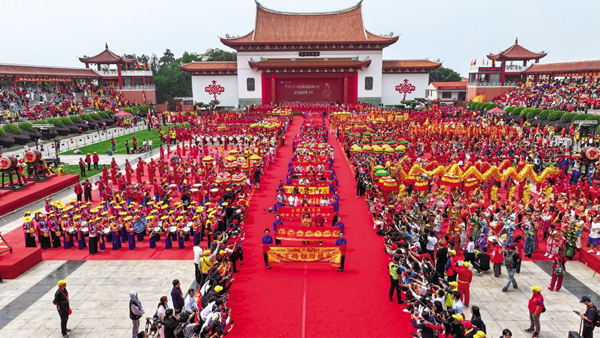 来自海内外150多家妈祖文化团体的近万名妈祖敬仰者相聚湄洲岛,共谒妈祖、共叙亲情。 (时报记者 翁志鹏 林锦堂 通讯员 程黎婷 林春盛)