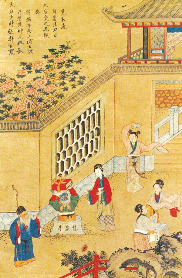 □黄劲 《天后显圣故事图轴》中“窥井得符” 仙游县枫亭灵慈庙妈祖故事壁画(局部) 《天后圣母事迹图志》中“窥古井喜得灵符” 《敕封天后志》中“窥井” 《天后圣母圣迹图志》中“窥井喜得灵符” 《天后本传》中“窥井得符” 《林妈祖志全图宝像》中“妃汲水井神传受天…